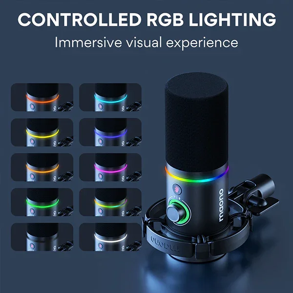 The PD200X can also compatible with Maono-link, choosing the perfect tone from your microphone, and you can turn on/off the RGB light or switch in 9 different colors, also supports EQ, limiter, and compressor adjustment in USB mode.